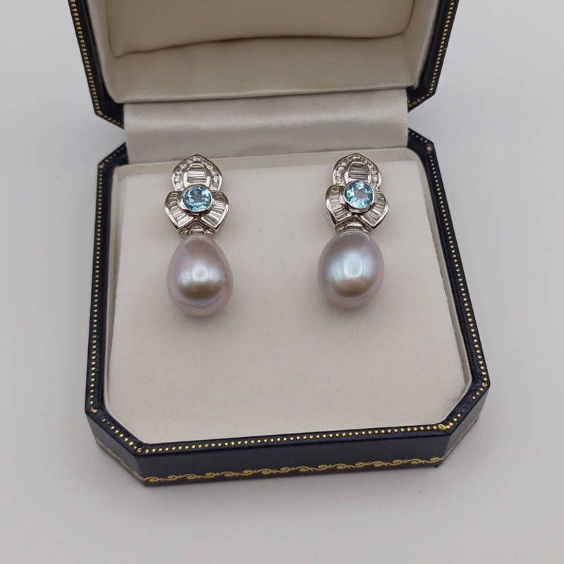 Pair of gold blue topaz, diamond & pearl earrings, the topaz set within a surround of baguette & brilliant cut diamonds with a grey pearl below - 3 cm long