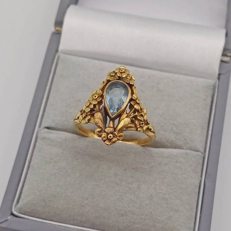 Early 20th century art nouveau gold & aquamarine ring, the pear shaped aquamarine set within a floral openwork mount - ring size j, 4.3g