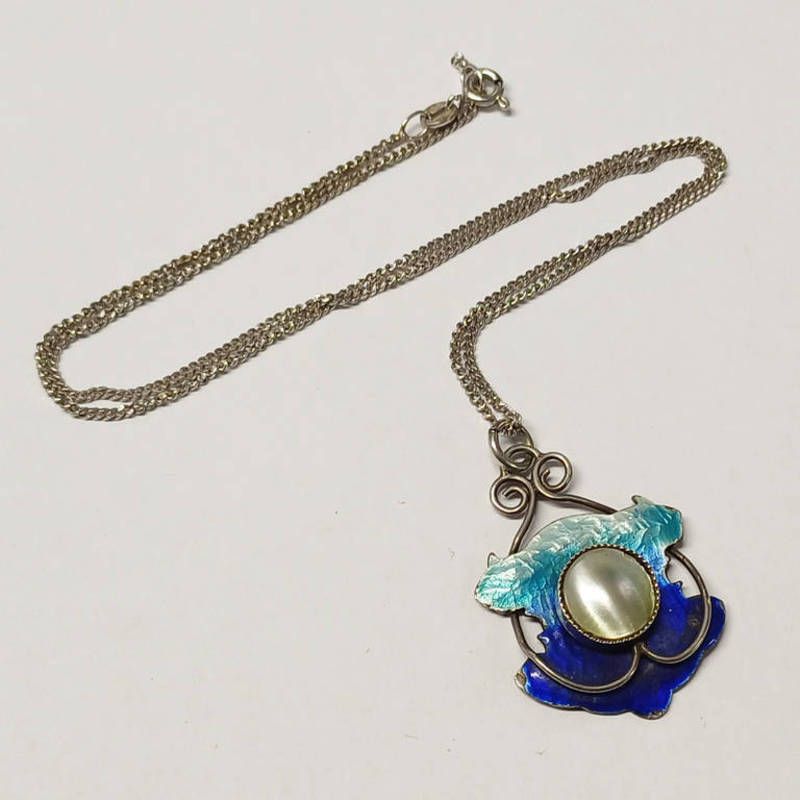 Arts & crafts style sterling silver & enamel pendant with mother of pearl set panel to centre on a silver chain