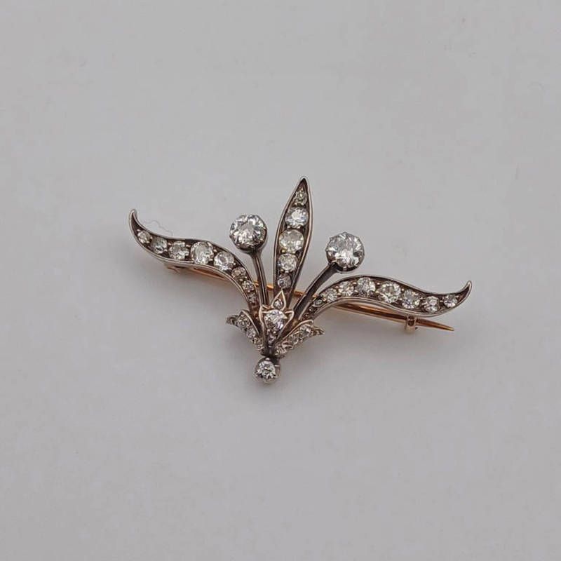 Victorian diamond set fleur de lys set brooch, the 2 principal diamonds approx 0.2 carats each - 4 cm long, 5.6 g