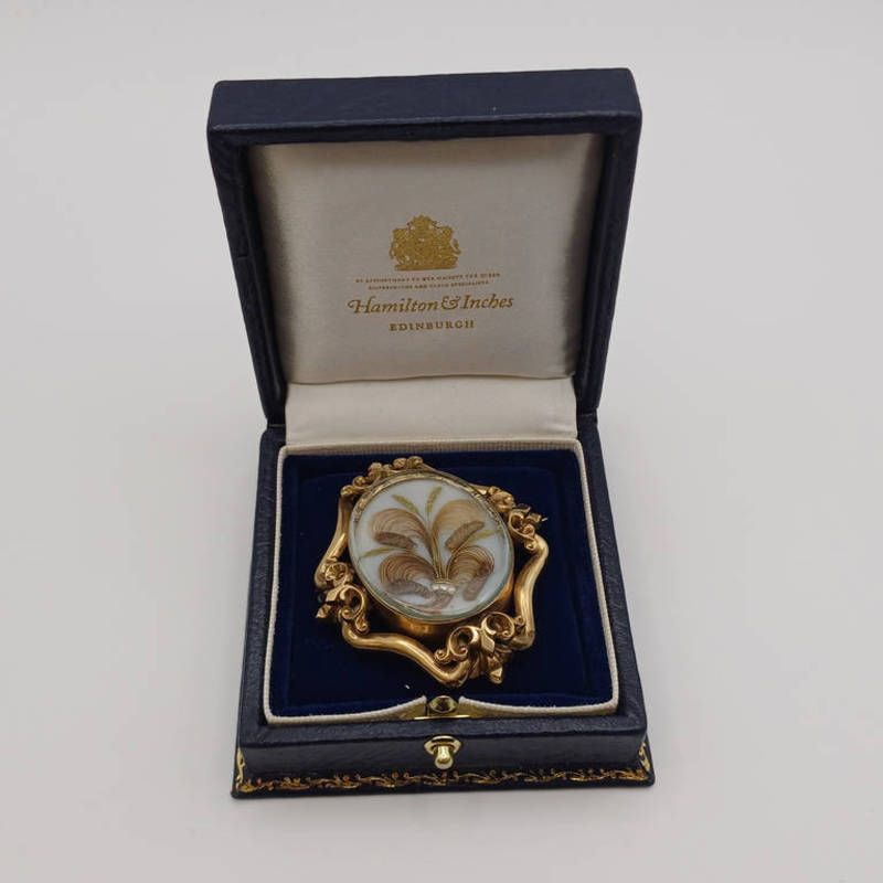 19th century pinch beck brooch with decorative hair panel in hamilton & inches box