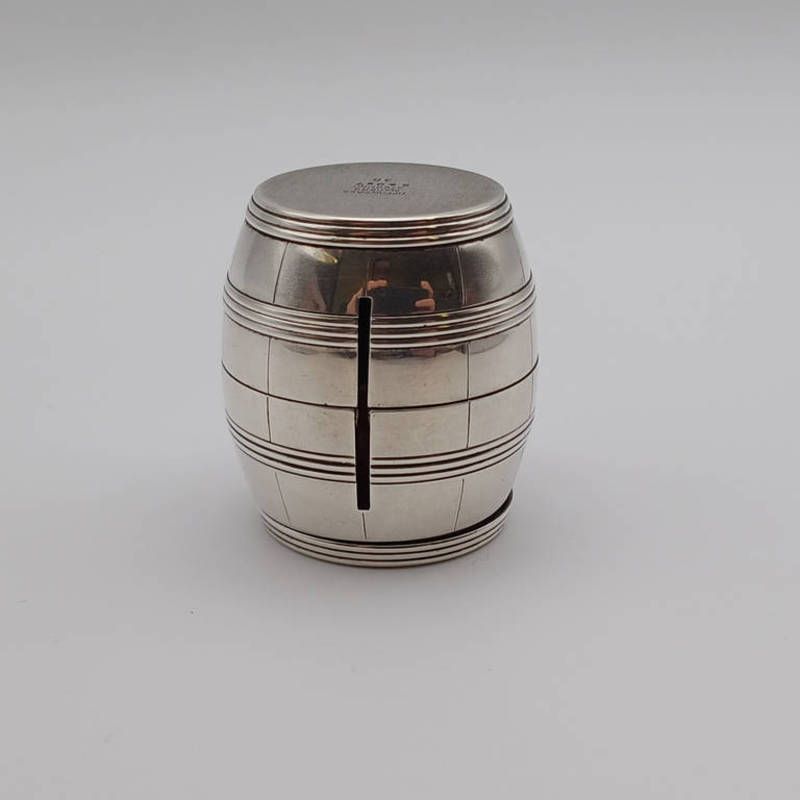A tiffany & co american silver stamp dispenser in the form of a barrel marked tiffany & co makers sterling to base, 4cm
