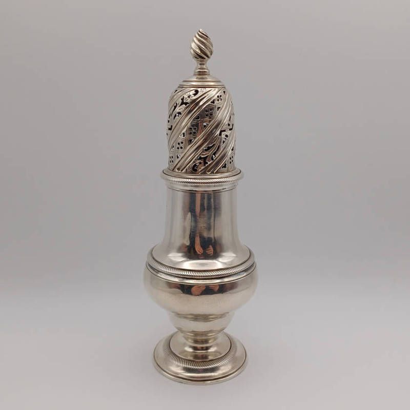 George ii silver sugar caster by john delmester, london 1759 - 13cm tall