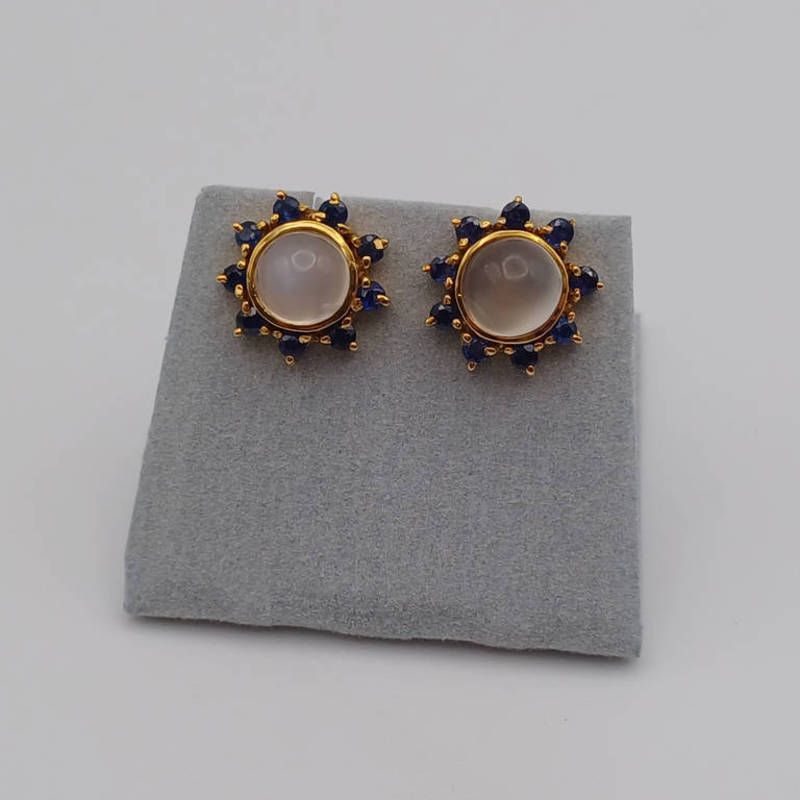 Pair gold sapphire & moonstone ear studs - 13.5 mm diameter, 4.3 g