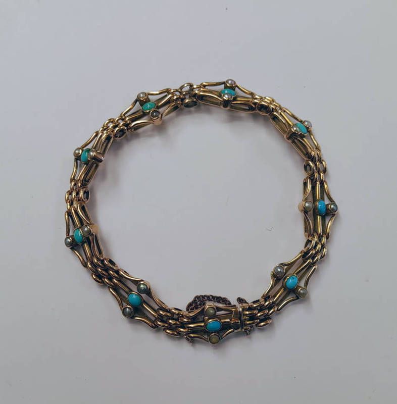 9ct gold gate bracelet set with turquoise and pearls, 20 cm - 16.9 g