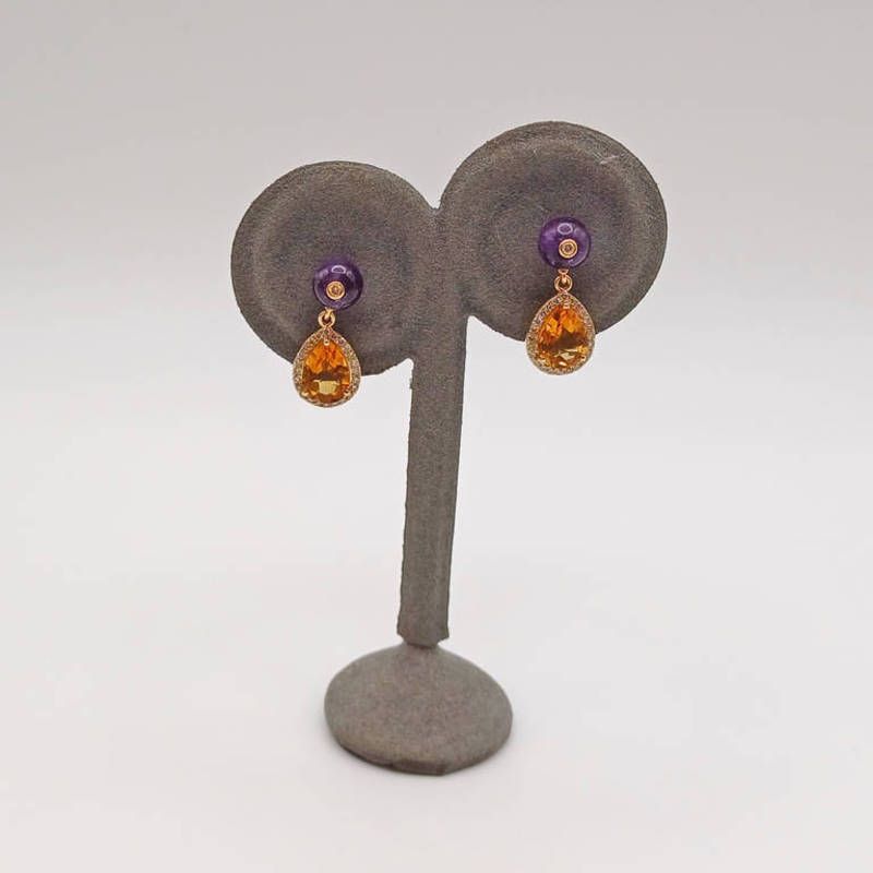 Pair of 14ct gold amethyst citrine & diamond earrings, the pear shaped citrines set within a surround of diamonds hung from a diamond set amethyst bead