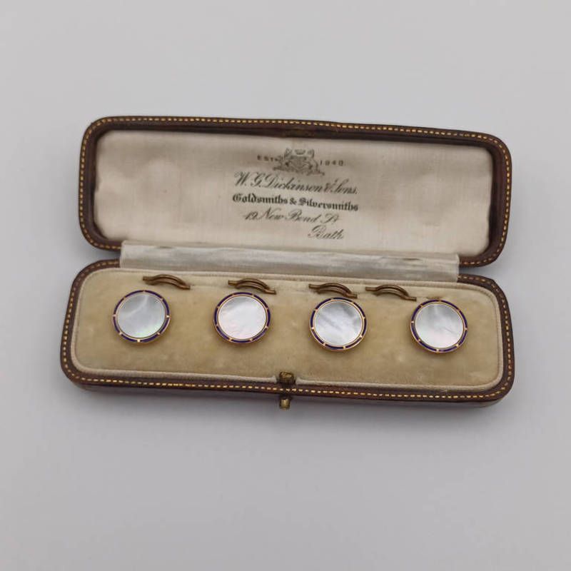 Cased set of 4 early 20th century 9ct gold enamel & mother or pearl buttons - 5.3 g in a wg dickinson & sons box