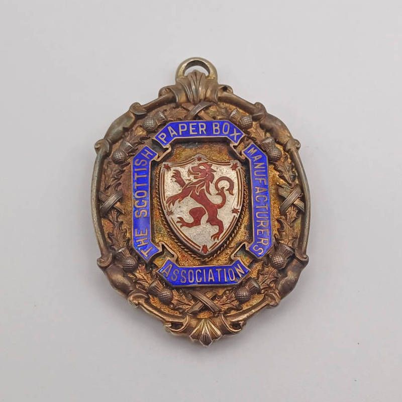 A silver & enamel medal for the scottish paper box manufacturers association with embossed thistle decoration & lion rampant to centre by dmg, birmingham 1931