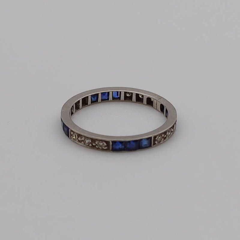 Early 20th century sapphire & diamond eternity ring with sets of calibre cut sapphires & single cut diamonds -r ring size p, 2.5 g