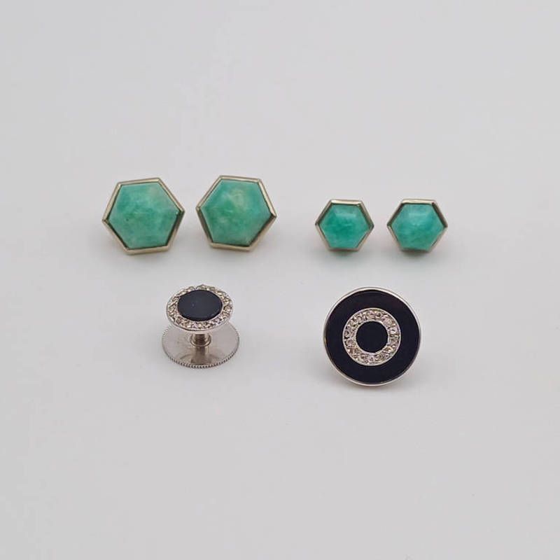 Pair of french 18ct gold & green hardstone buttons, & matching studs 18ct gold onyx & diamond button & similar stud - 9.5 g total