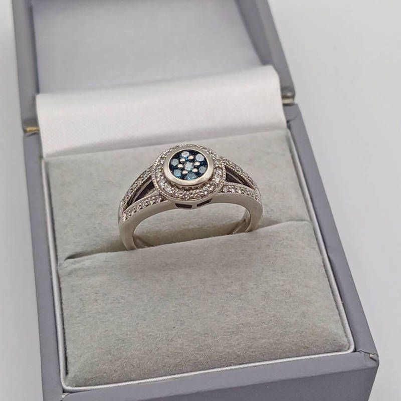 14k gold diamond cluster ring, the blue coloured diamonds set within a surround of brilliant cut diamonds with diamond set bifurcated shoulders - 4.4g, ring size m