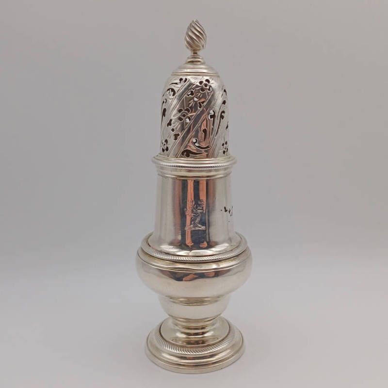 George ii silver sugar caster by john delmester, london 1759 - 13cm tall