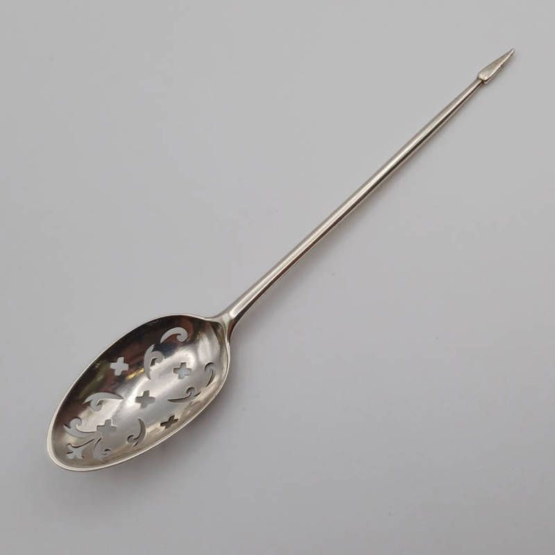 An 18th century silver mote spoon with decorative pierced bowl, inscribed di to back of...