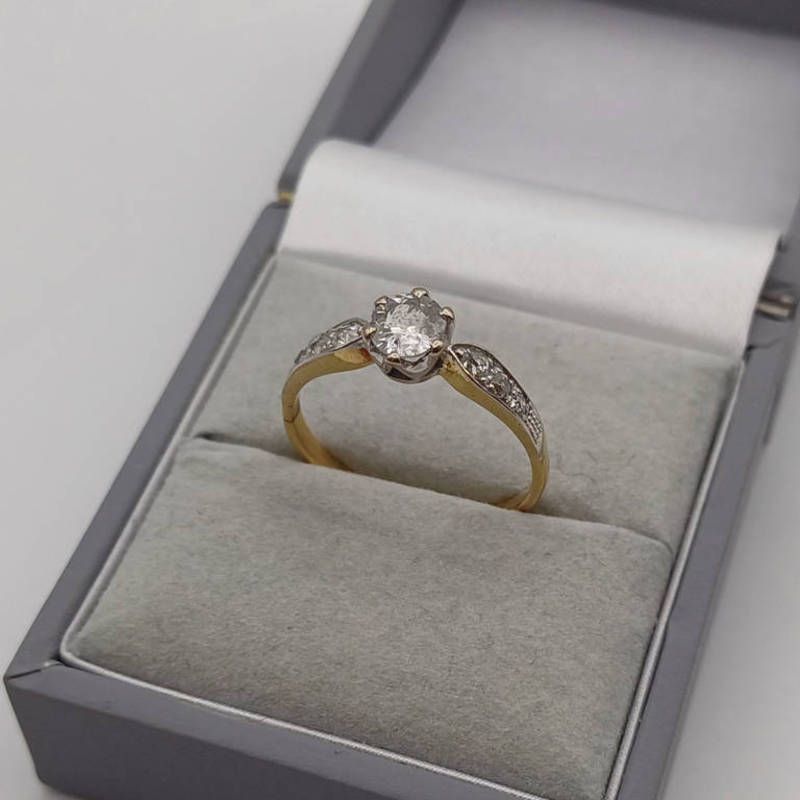 Gold diamond single stone ring, the diamond approx 0.45 carats with diamond set shoulders - ring size p