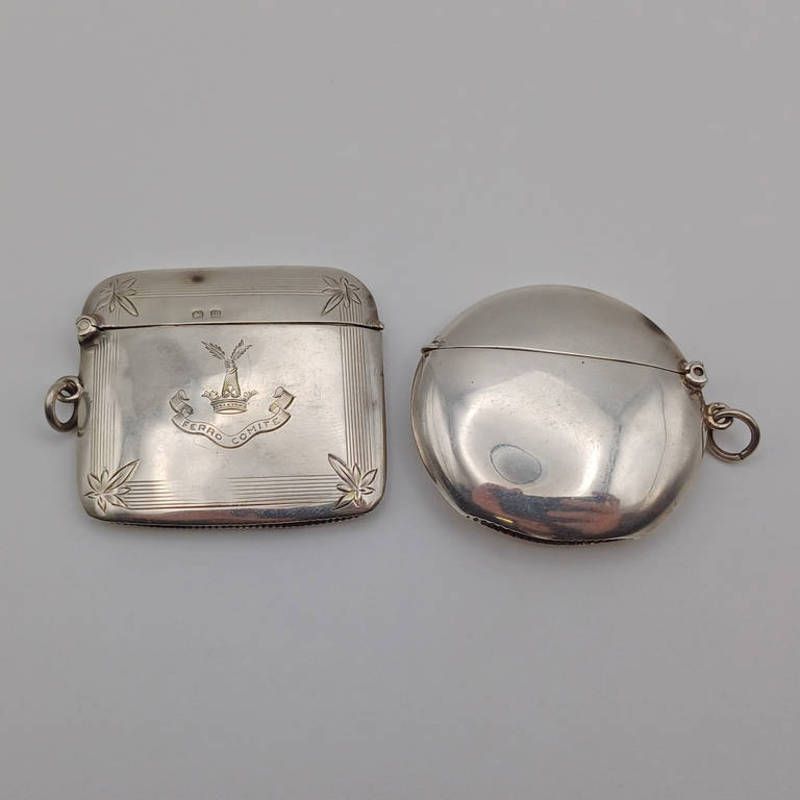 2 silver vesta cases, 1 rectangular form with engraved decoration by mappin & webb ltd, birmingham 1911, the other circular form with gilded interior by patterson & sons ltd, birmingham 1911