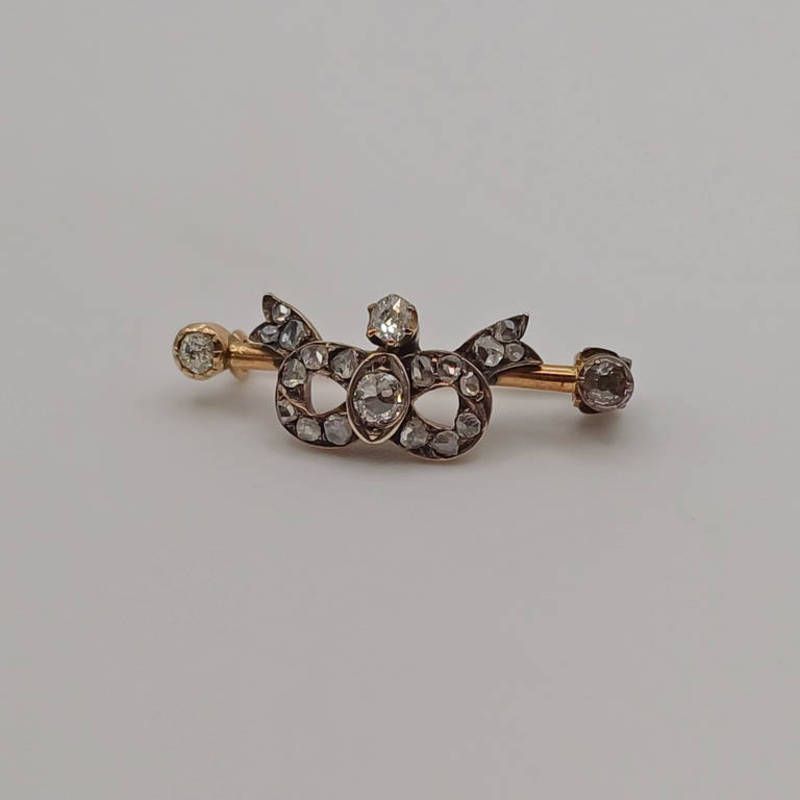 19th century gold & silver diamond set ribbon bow bar brooch - 3cm long, 3.5 g