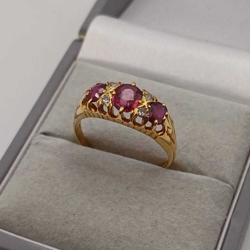 Early 20th century 18ct gold ruby & diamond ring, set with 3 oval rubies & 2 pairs of diamonds - ring size n 1/2