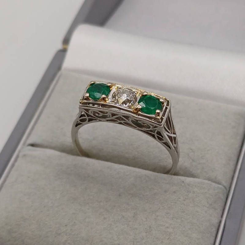 Early 20th century 3-stone emerald & diamond ring, the central diamond approx. 0.25 carats flanked by 2 circular cut emeralds. ring size o