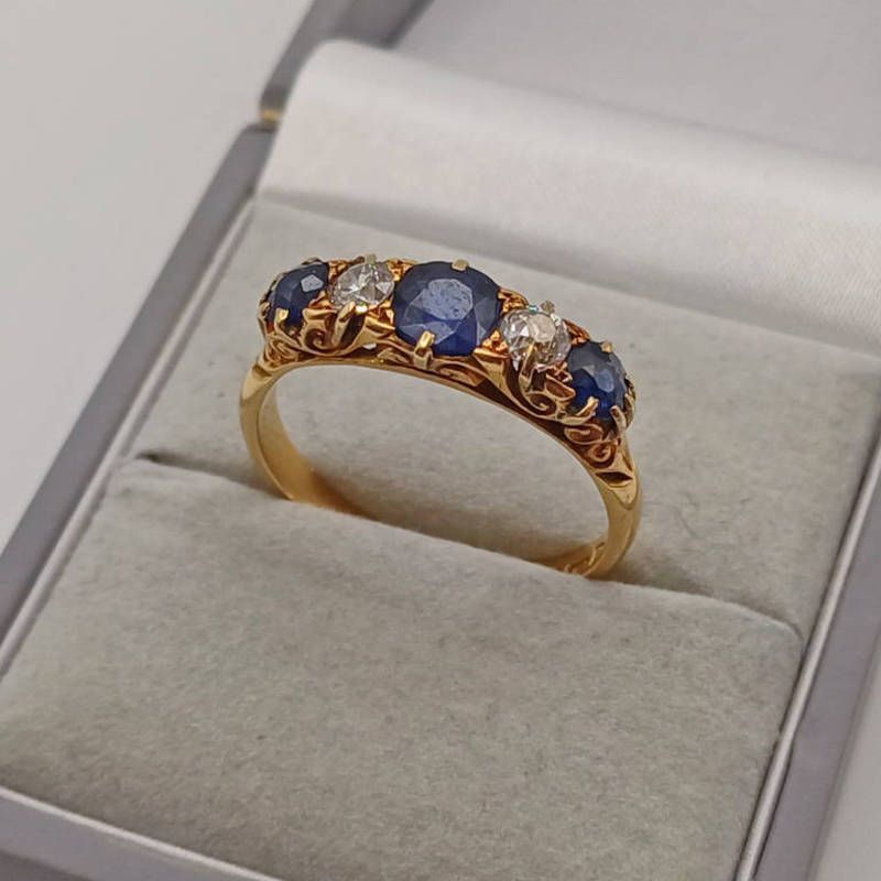 Early 20th century 18ct gold sapphire & diamond 5-stone ring in scroll setting - ring size r, chester 1905