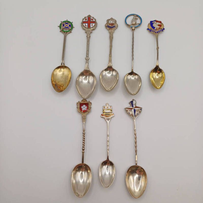 8 enamel crested silver teaspoons from various makers & dates. 104 g