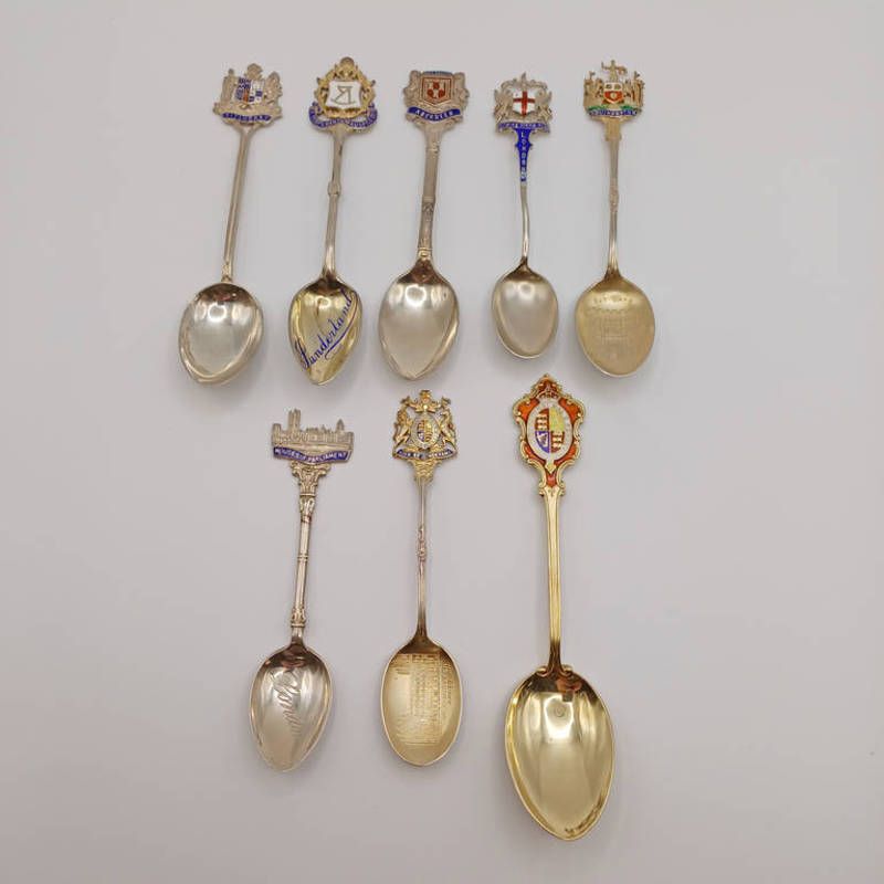 8 enamel crested silver teaspoons from various makers & dates. 107 g