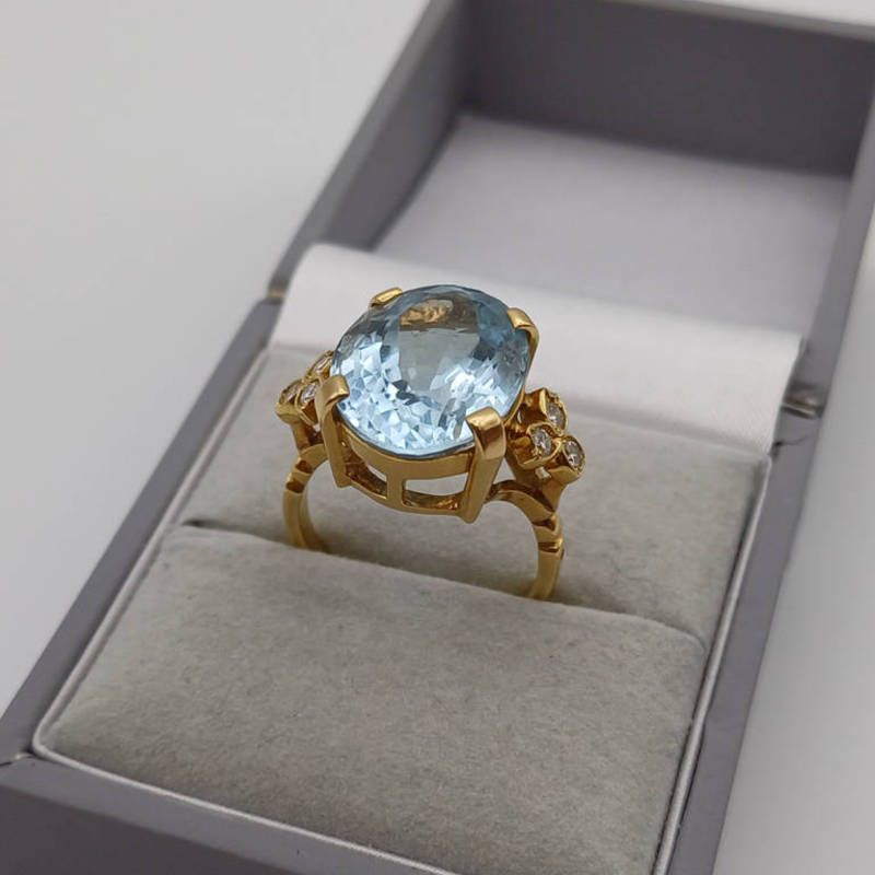 Gold blue topaz & diamond set ring, the oval faceted topaz approx 11.4 carats set between diamond set shoulders - ring size m, 6.9 g