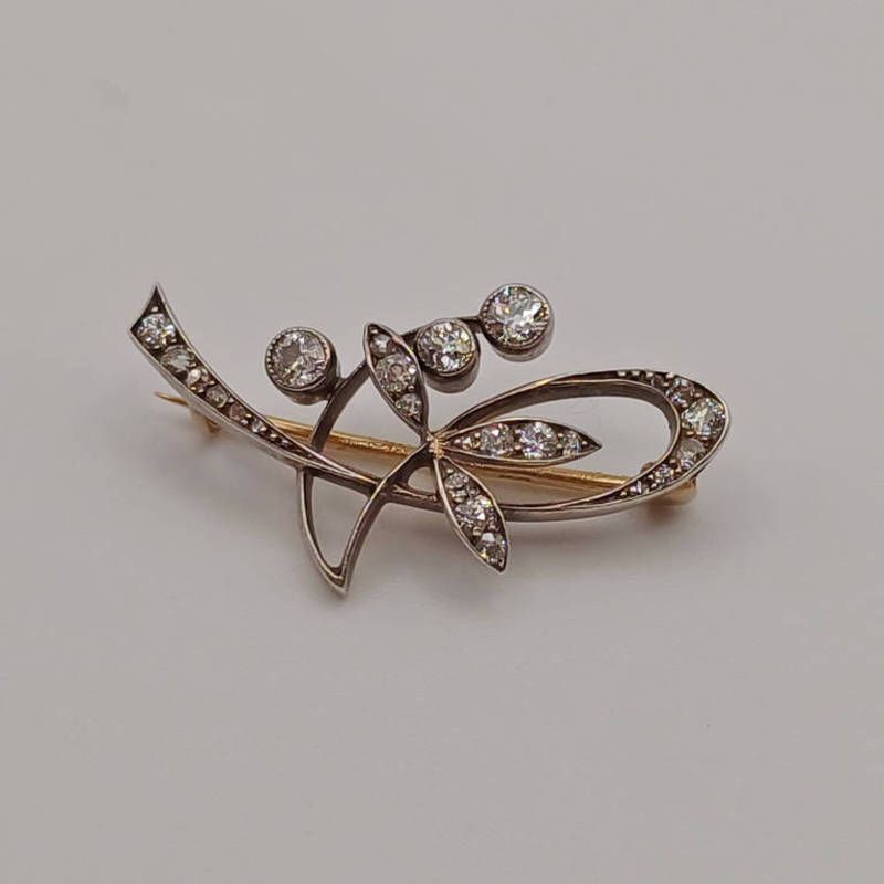 Art nouveau silver & gold diamond set stylised floral brooch - 3.4cm long, marks to bar