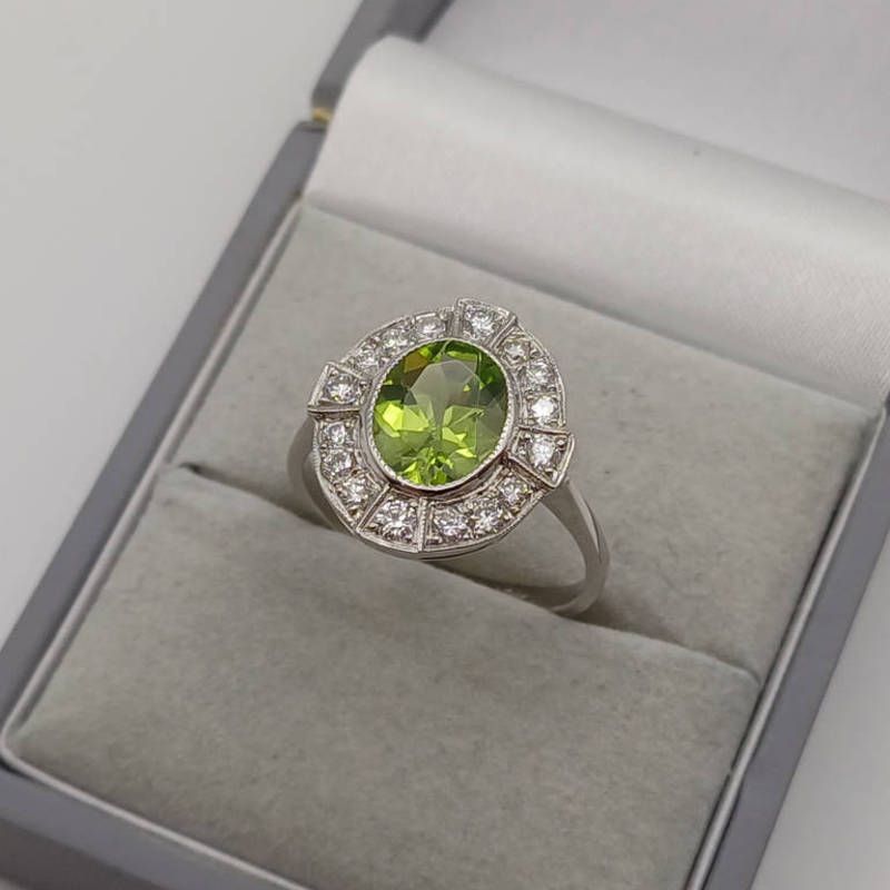 Art deco style platinum set peridot & diamond set ring, the oval peridot set within a surround of brilliant cut diamonds approx. 0.5 carats in total - ring size m