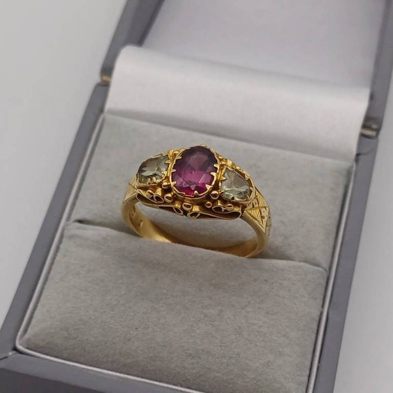Victorian 18ct gold chrysolite & garnet 3 - stone ring in scroll setting, hallmarked birmingham 1887 - 4.6g, ring size n