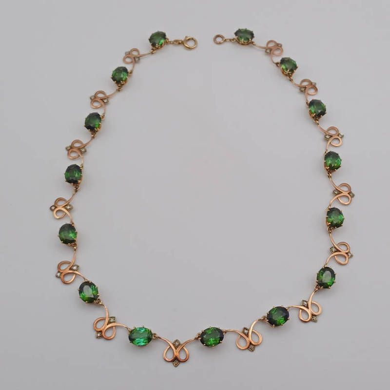 Early 20th century 9k gold green tourmaline & diamond necklace, the oval cut tourmaline set with scrolling stylised panels studded with diamonds - 37.5 cm long, 18.2 g