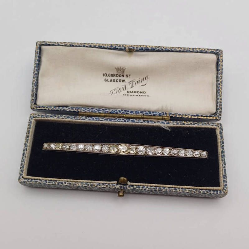 An art deco diamond set bar brooch, the cushion shaped diamonds very approx. 1.5 carats in total - 7.5cm long