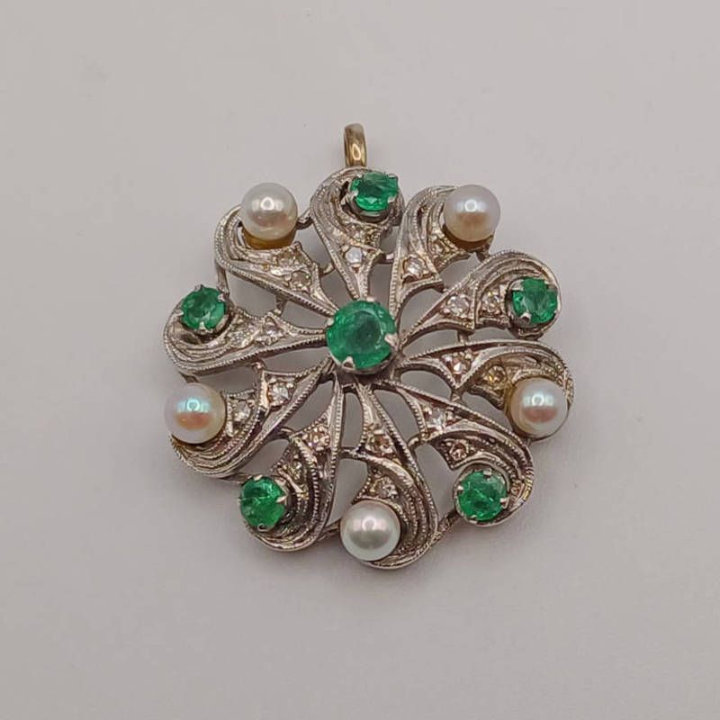 Gold pearl, diamond & emerald circular pierce work brooch - 3 cm diameter, 8.5 g, converted