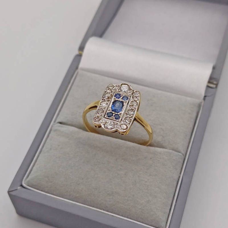 Early 20th century 18ct gold & platinum art deco sapphire & diamond panel ring, the 5 oval & circular sapphires set within a surround of diamonds - ring size q, 2.7 g