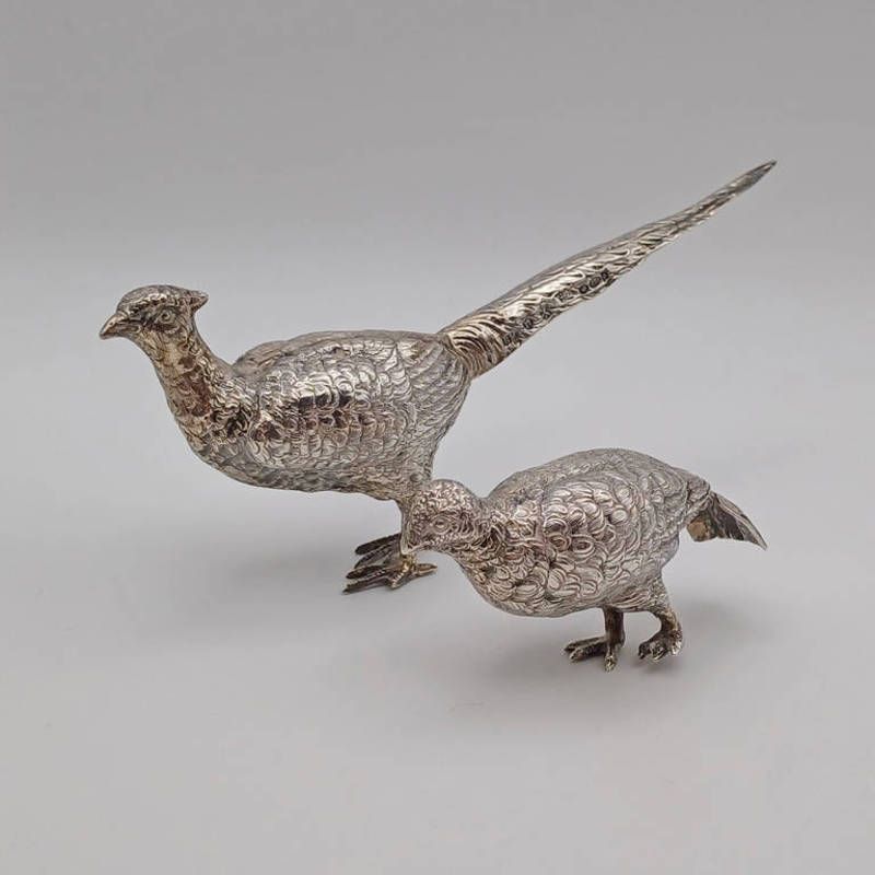 A silver model of a pheasant marked 925, makers mark b m & a white metal unmarked model of a pheasant, longest 15cm, total weight 93g