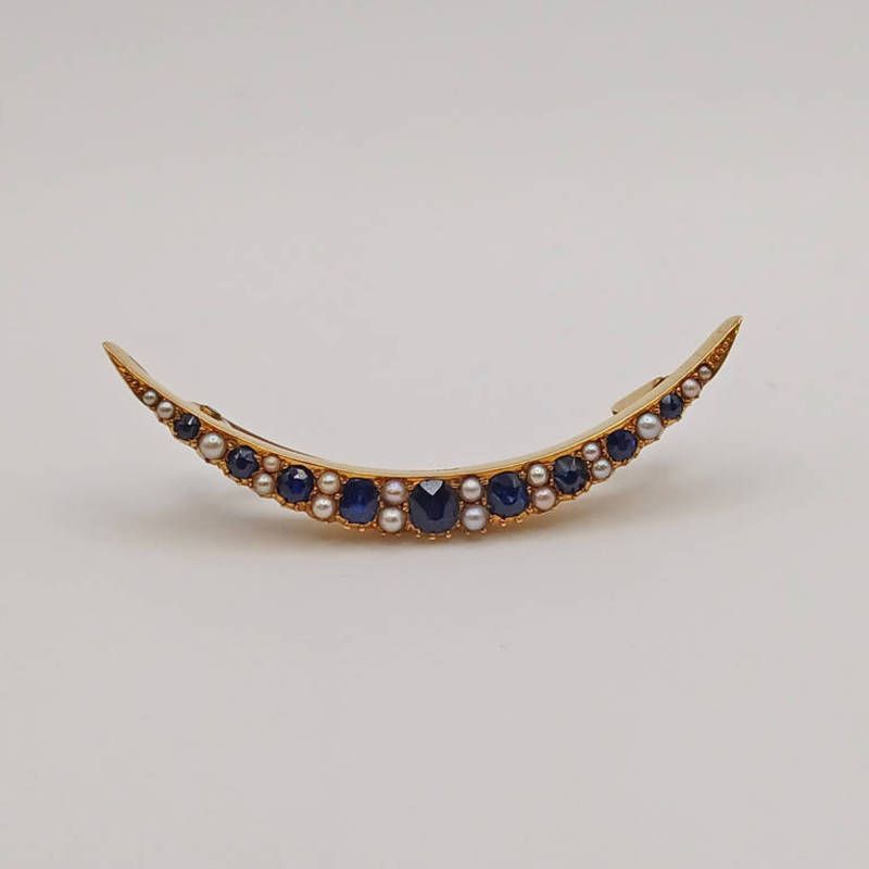 Early 20th century 18ct gold sapphire & seed pearl crescent brooch, the graduated oval sapphires interspersed with pairs of pearls - 5 cm long, 6.6 g