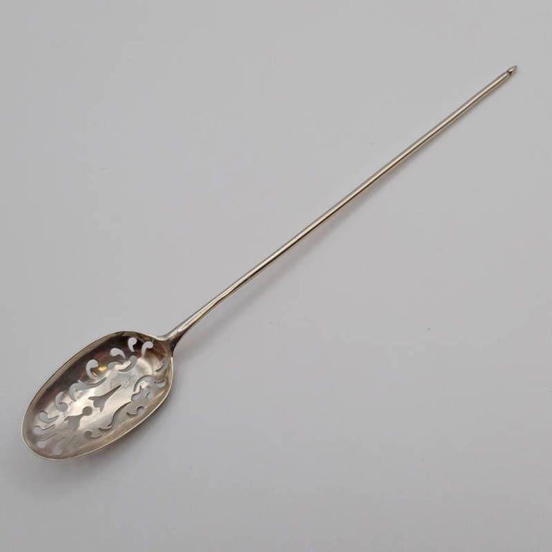 An 18th century silver mote spoon with decorative pierced bowl, inscribed di to back of bowl, unmarked