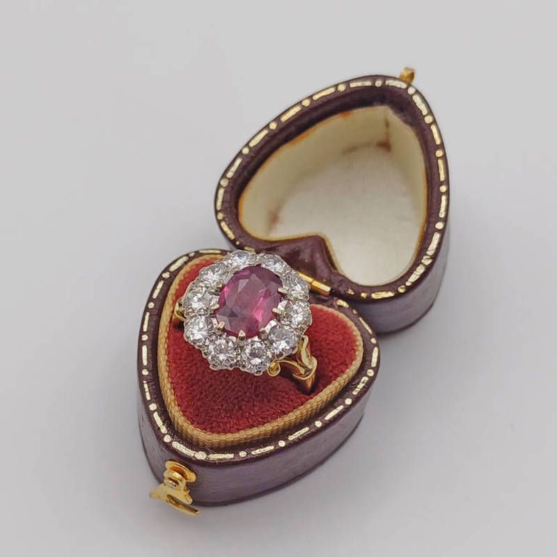 18ct gold ruby & diamond cluster ring, the oval ruby approx 1.6 carats set within a surround of 10 brilliant cut diamonds approx 1.50 carats in total - ring size k 1/2