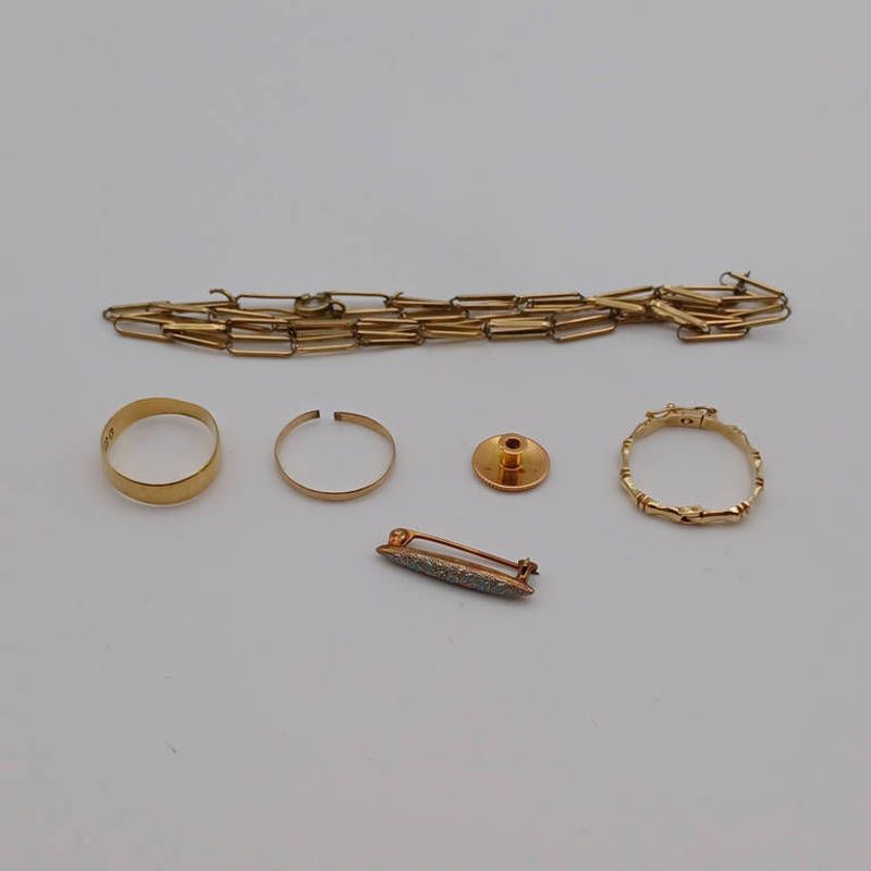 14k earring - 1.4 grams, 9ct gold chain - as found, 4.1 grams, 18ct gold wedding band - 1.2 grams, 15ct gold stud - 0.6g, gold brooch, gold ring 1.8 grams