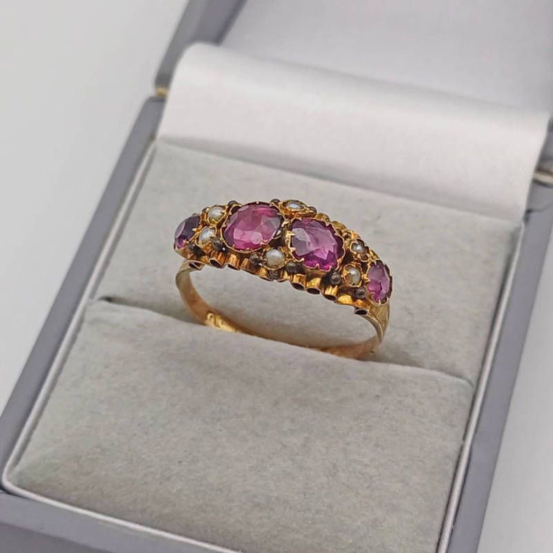 15ct gold seed pearl & garnet set ring, birmingham 1920 - ring size p, 1.8 g