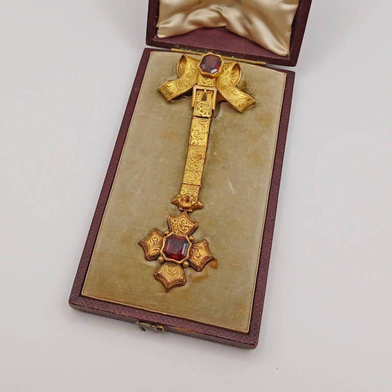 Late 19th or early 20th century yellow metal articulated drop brooch with scroll belt top set with garnet articulated buckle & strap terminating in a garnet set cross with foliate engraved decoration in a fitted case, 10cm long, unmarked, previously valued for insurance as 15ct gold