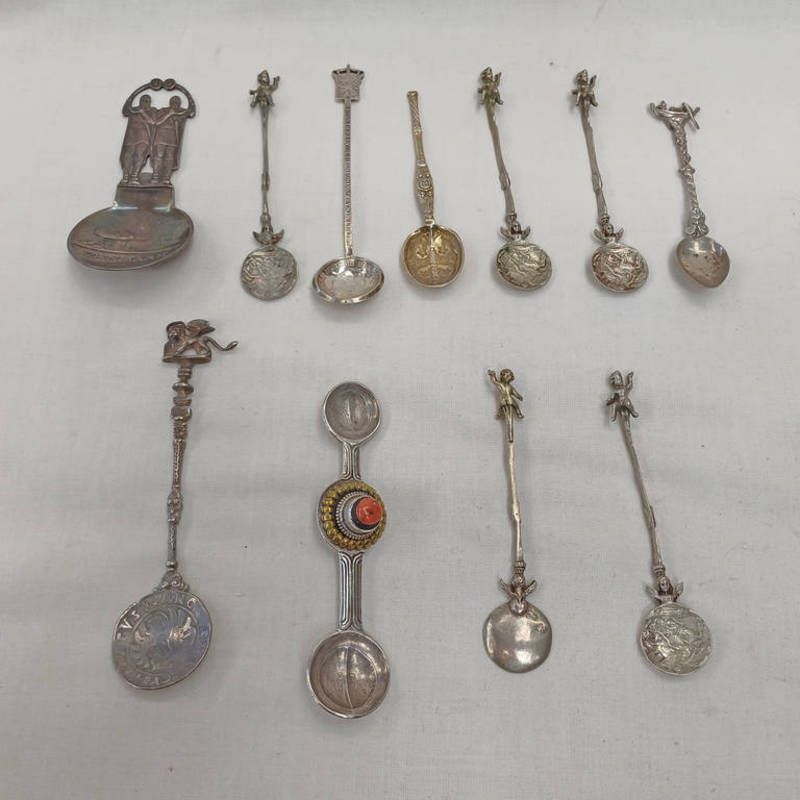 Various interesting spoons one with 1940 1 guilder bowl, 1 marked danmark others with george the dragon bowl, etc