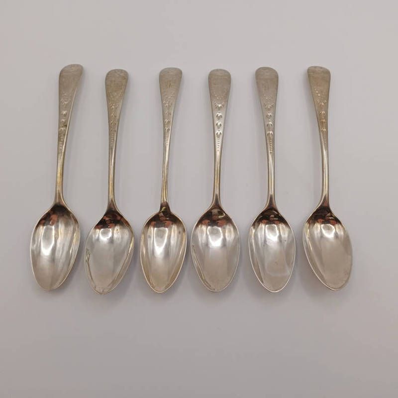 A set of 6 george iii silver teaspoons with engraved handles by george smith & thomas hayter, london 1795. 82g