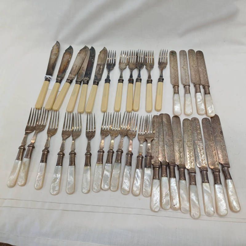 Set of 12 silver plated mother of pearl handled forks & knives with silver mounts sheffield 1897 & 6 plated fish forks & knives with mounts marked sterling silver