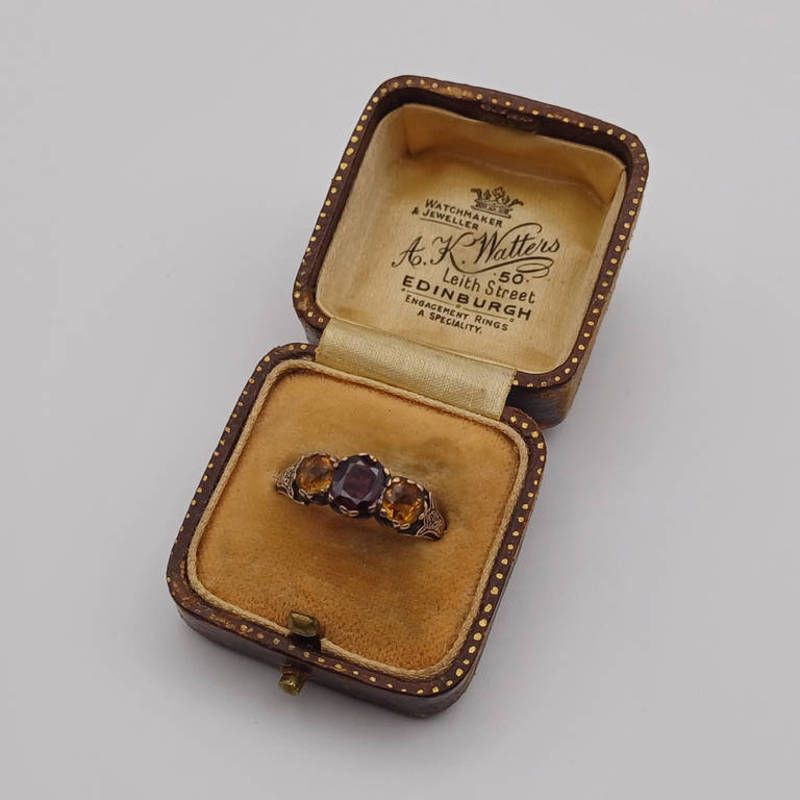 Early 19th century scottish provincial gold garnet & citrine set ring by donald fraser of inverness. the oval garnet flanked by 2 circular cut citrines in an engraved decorative mount with hallmark df invss - 2.5g, ring size q