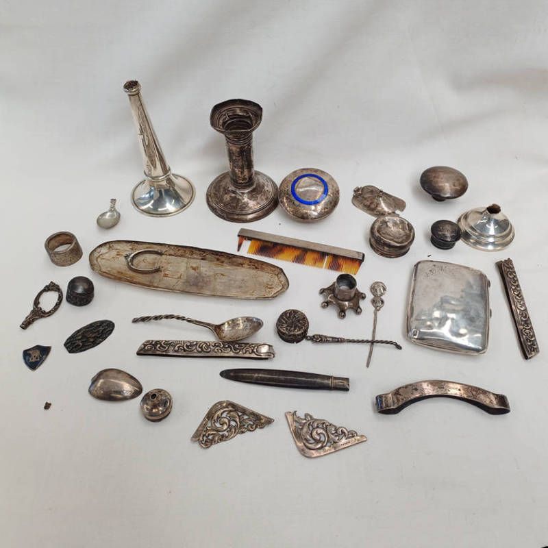 Good selection of silver items including comb back circular lid etc total weight including candle with fitted base etc . 42 grams