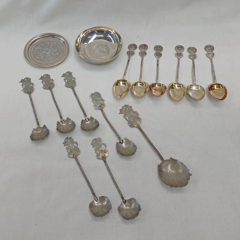 Set of 6 oriental white metal teaspoons , weight 51 grams & 6 metal teaspoons & 1 larger one, weight 50 grams and one circular dish with a sultan ahmad shah qajar 5000 dinars coin in middle and one other persian dish made by vartan a.o. weight 68 grams