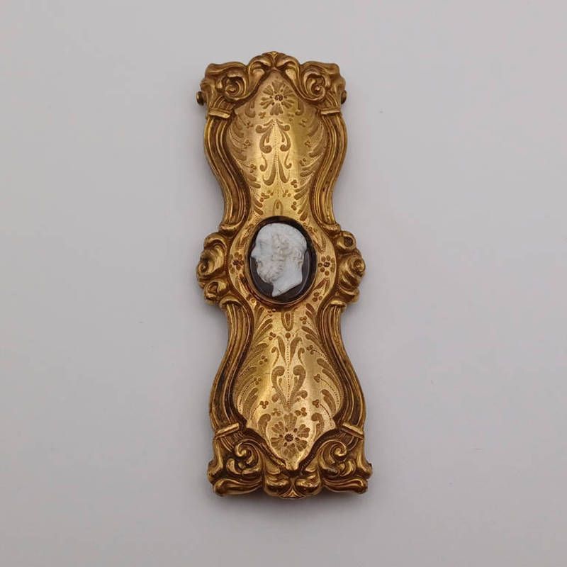 French gilt metal buckle with hardstone cameo. length 9 cms