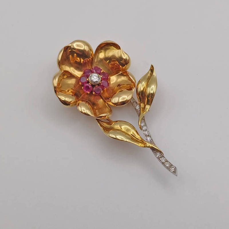 Ruby & diamond set floral brooch with a central cluster of diamonds & rubies set with yellow metal petals & a diamond set stem - 1 diamond missing - 6.5cm long, 20g