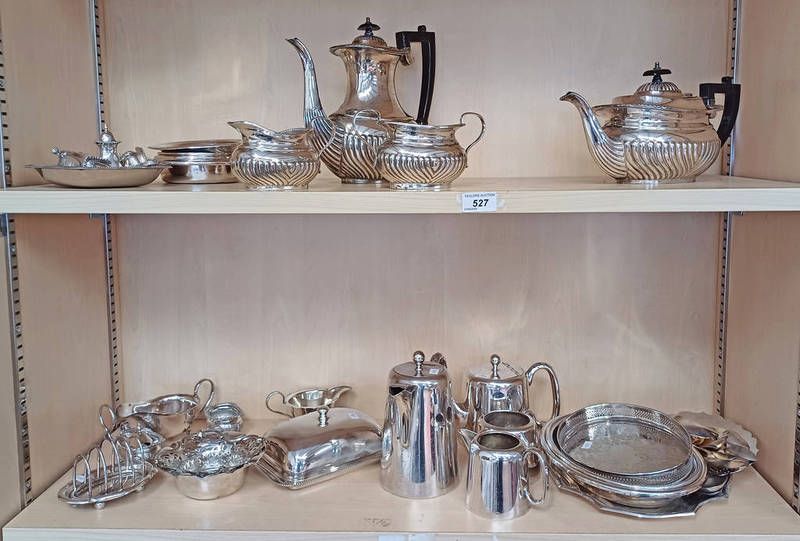 Selection of silver plated ware including 4 piece teaset x 2, various dishes, etc on 2 shelves