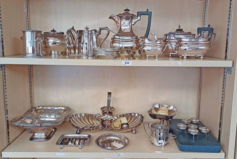 Selection of silver plated ware including 3 piece teaset, swing handled basket etc. on 2 shelves